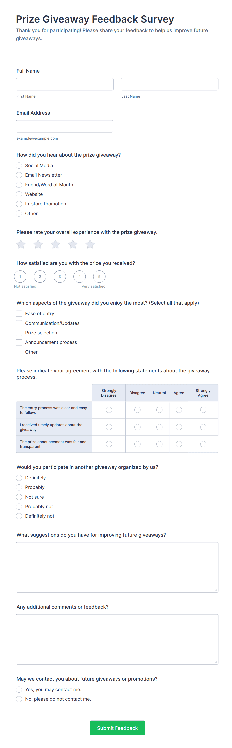 Giveaway forms are specialized online forms designed to facilitate the organization and management of contests, sweepstakes, raffles, and promotional giveaways. These forms are used to collect participant information, ensure fair entry processes, and streamline the selection of winners. Businesses, nonprofits, influencers, and event organizers often use giveaway forms to boost engagement, grow their audience, collect leads, or promote products and services. Typical use cases include social media contests, product launches, event promotions, charity raffles, and customer appreciation campaigns.