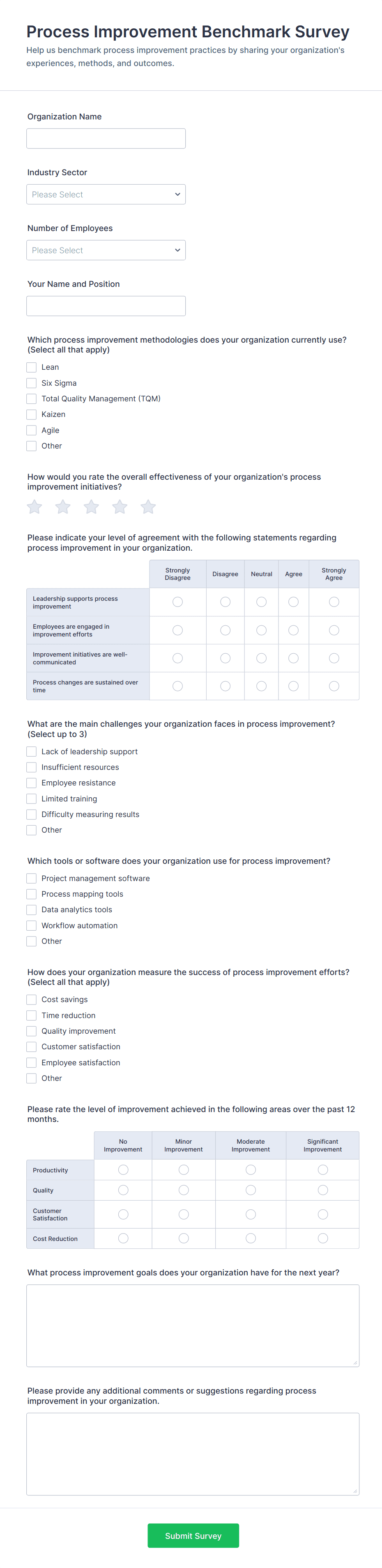 - Employee surveys might include Likert scales, training evaluation fields, and suggestions for process improvement.