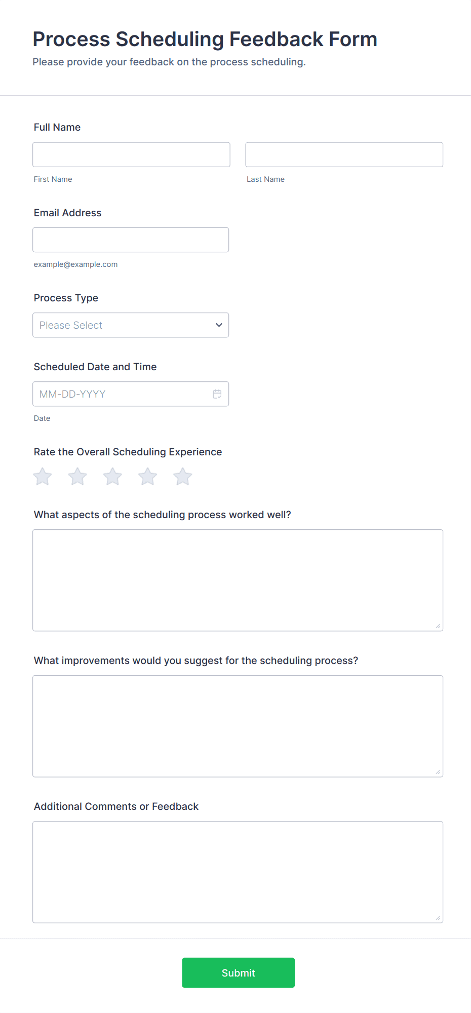 • Product feedback forms may include questions about usability, features, and likelihood to recommend.