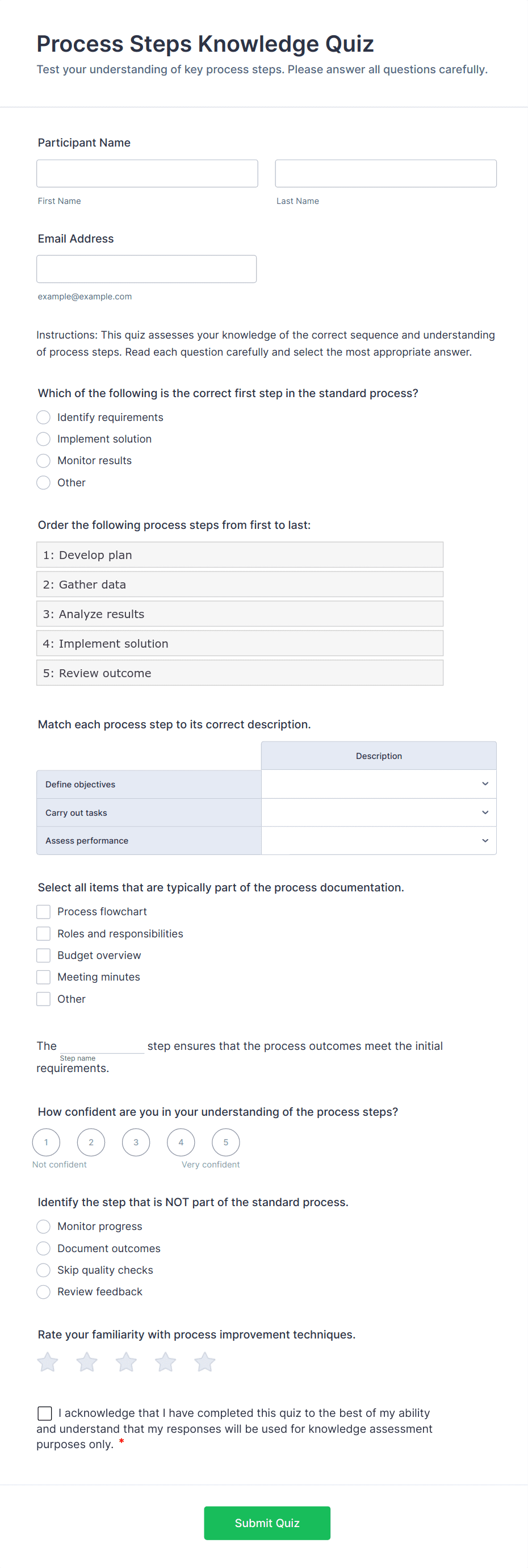 Quiz Templates are pre-designed forms specifically created to facilitate the process of building quizzes for a variety of purposes, such as education, employee training, lead generation, event engagement, and more. These templates provide a structured way to present questions, collect answers, and automatically score or evaluate responses. Whether you’re a teacher assessing student knowledge, a business running a product knowledge test, or a marketer creating a fun personality quiz, Quiz Templates offer a flexible foundation to suit your needs. They can be used for online exams, trivia games, onboarding assessments, customer feedback quizzes, and interactive learning modules.