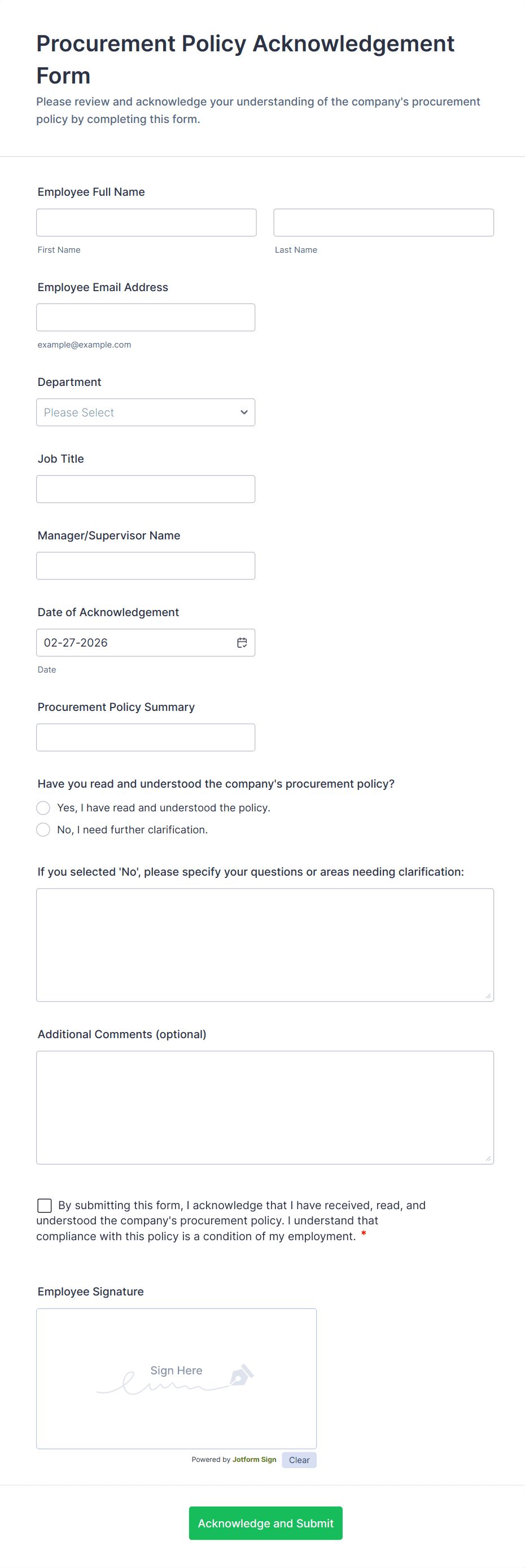 The form templates here are for informational purposes only. Jotform is not providing legal, financial, or other advice, or implying that the forms are legally valid in all or any jurisdictions. Before using any such form, consult an attorney and/or other applicable professionals to make sure that the form meets your needs, legally and otherwise.
