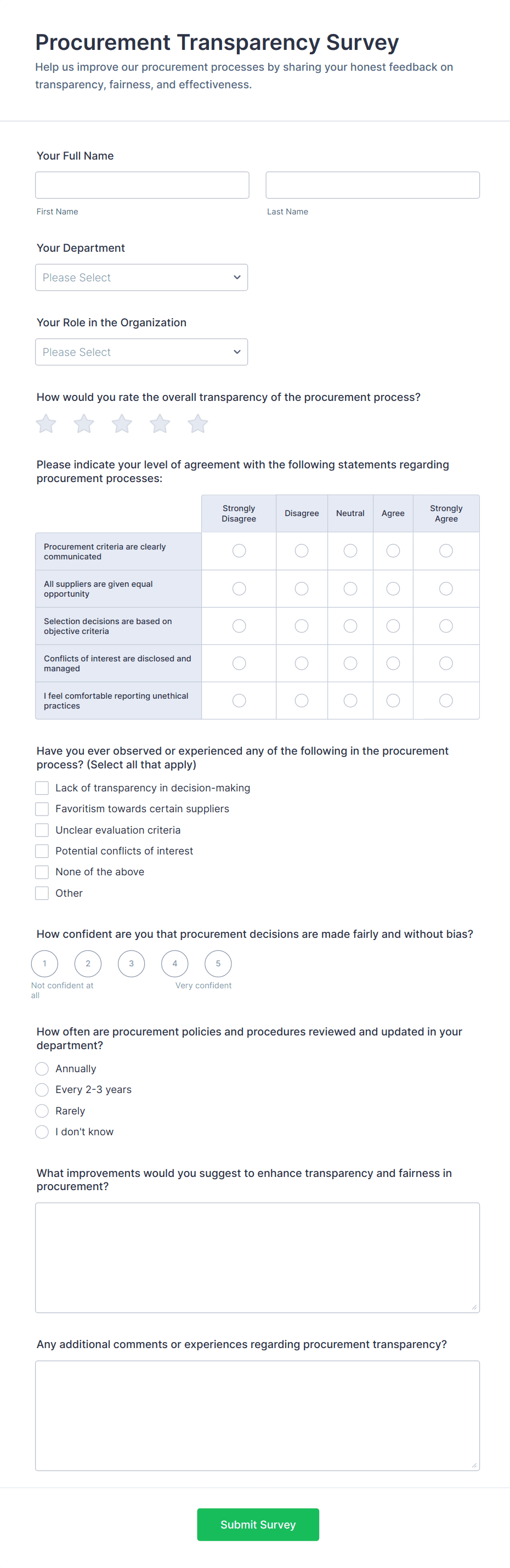 For employee surveys, consider adding anonymity options; for customer surveys, include contact fields if follow-up is needed.