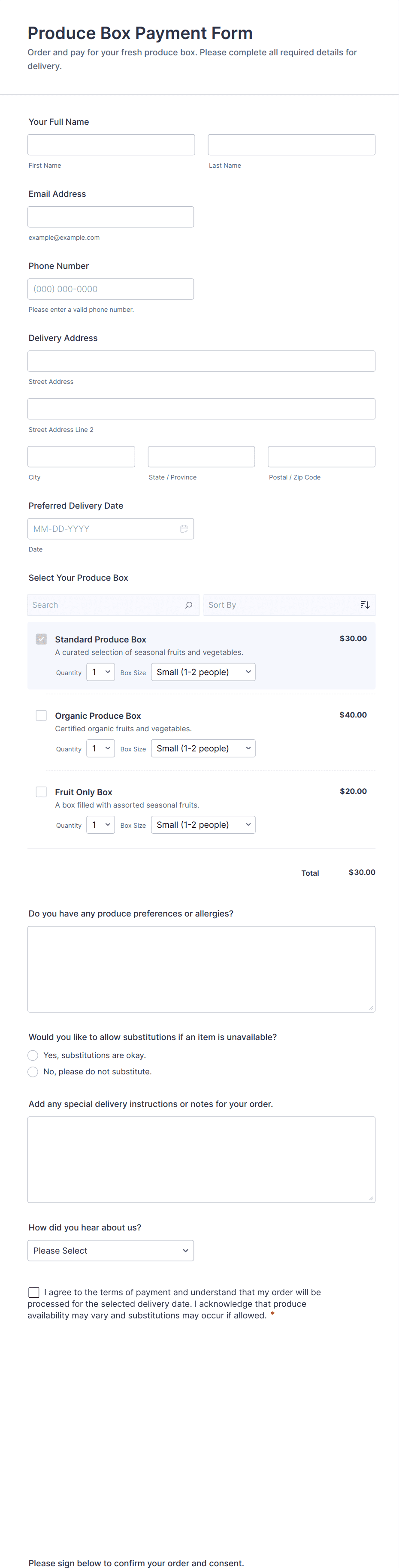 Process grocery orders and payments online. Customize this free Grocery Order Form for your store. No coding required. Easy to share with delivery staff.