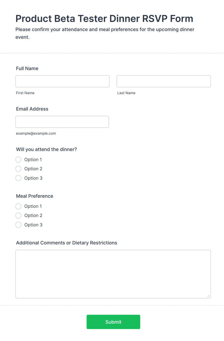 RSVP forms are digital tools designed to collect responses from invitees regarding their attendance at events, gatherings, meetings, or special occasions. Whether you’re organizing a wedding, corporate seminar, birthday party, or community event, RSVP forms streamline the process of confirming guest participation, gathering essential details like meal preferences, plus-ones, or special requirements. These forms help event organizers efficiently manage headcounts, plan logistics, and ensure a smooth experience for both hosts and attendees. The versatility of RSVP forms means they can be tailored for formal galas, casual get-togethers, virtual webinars, or even recurring club meetings.