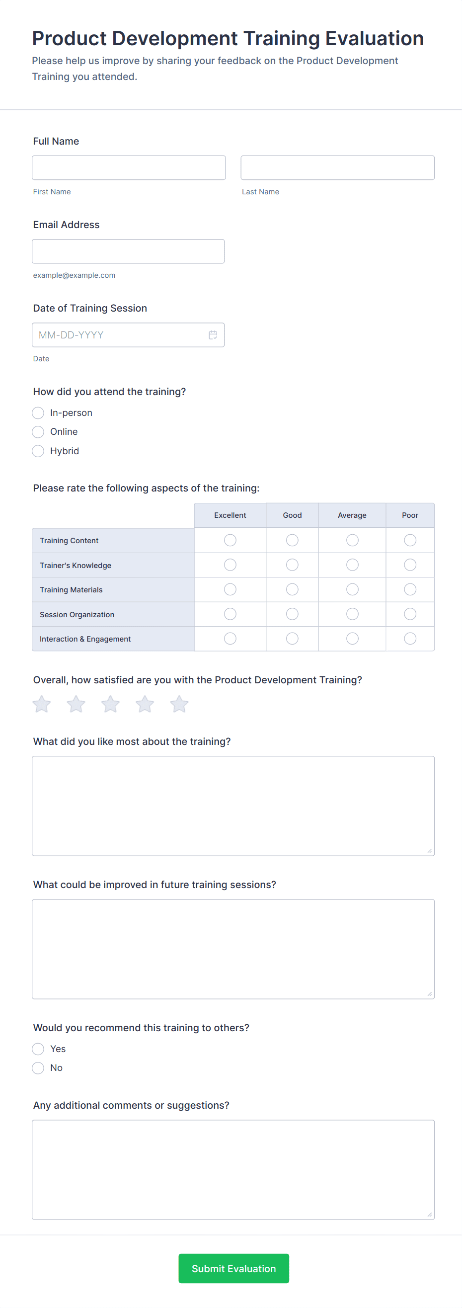 Training evaluation forms are structured documents used to collect feedback and measure outcomes after a training session, workshop, course, or onboarding program. They help organizations assess training effectiveness, instructor performance, content clarity, and learner satisfaction in a consistent way. Training evaluation forms are commonly used by HR, L&D teams, schools, corporate trainers, and program coordinators for onboarding evaluations, workshop feedback, certification programs, and internal skill training. By standardizing evaluation data, these forms make it easier to improve training content, identify skill gaps, and track program quality over time.