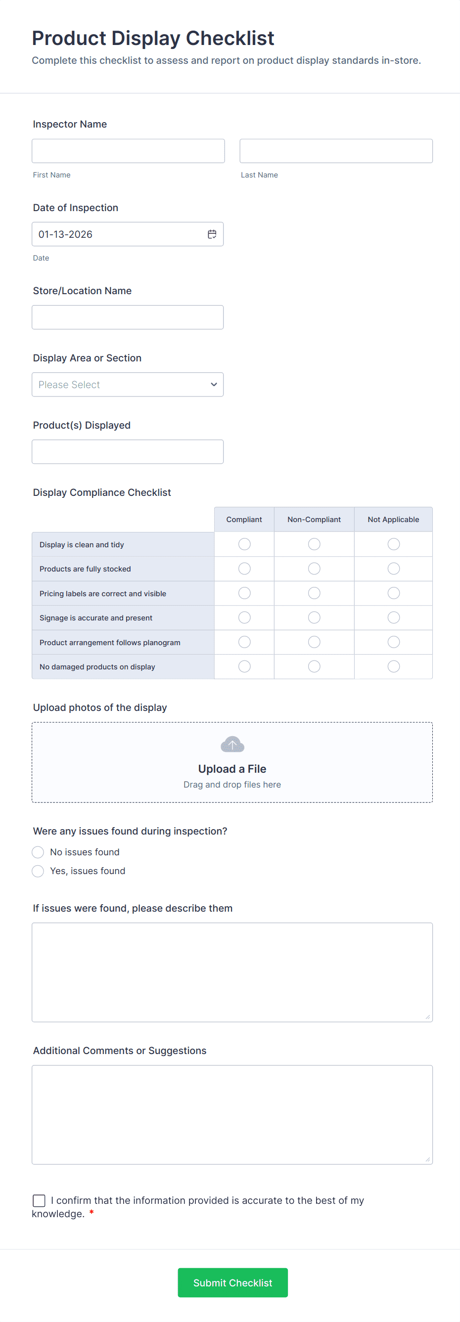 • For more complex checklists, add dropdowns, file upload fields (for attaching evidence or reports), or signature fields (for verification).