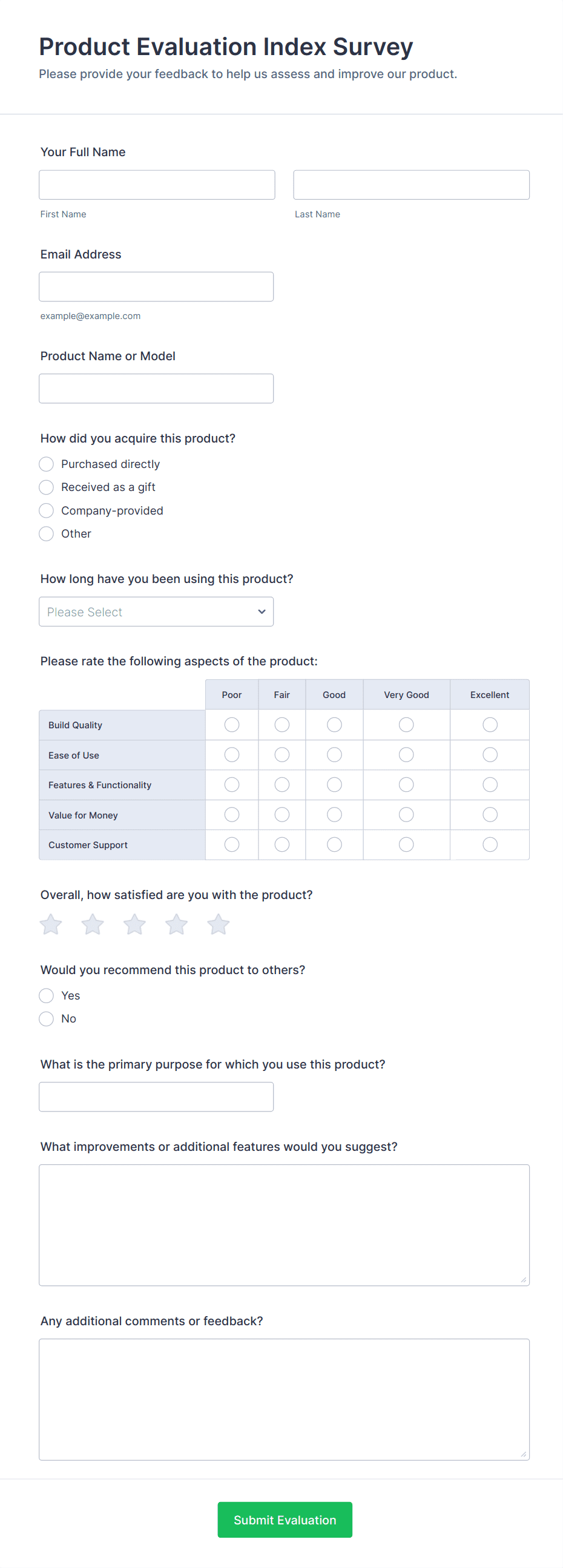 Product Survey Templates are pre-designed forms specifically created to help businesses, product managers, marketers, and researchers gather valuable feedback about products from customers, users, or stakeholders. These templates are used to assess customer satisfaction, collect suggestions for improvement, evaluate product features, and understand user experiences. Product survey forms can be utilized at various stages of a product’s lifecycle — from initial concept testing and beta launches to post-purchase feedback and ongoing product improvement. Common use cases include new product feedback, feature prioritization, usability testing, and post-launch satisfaction surveys.