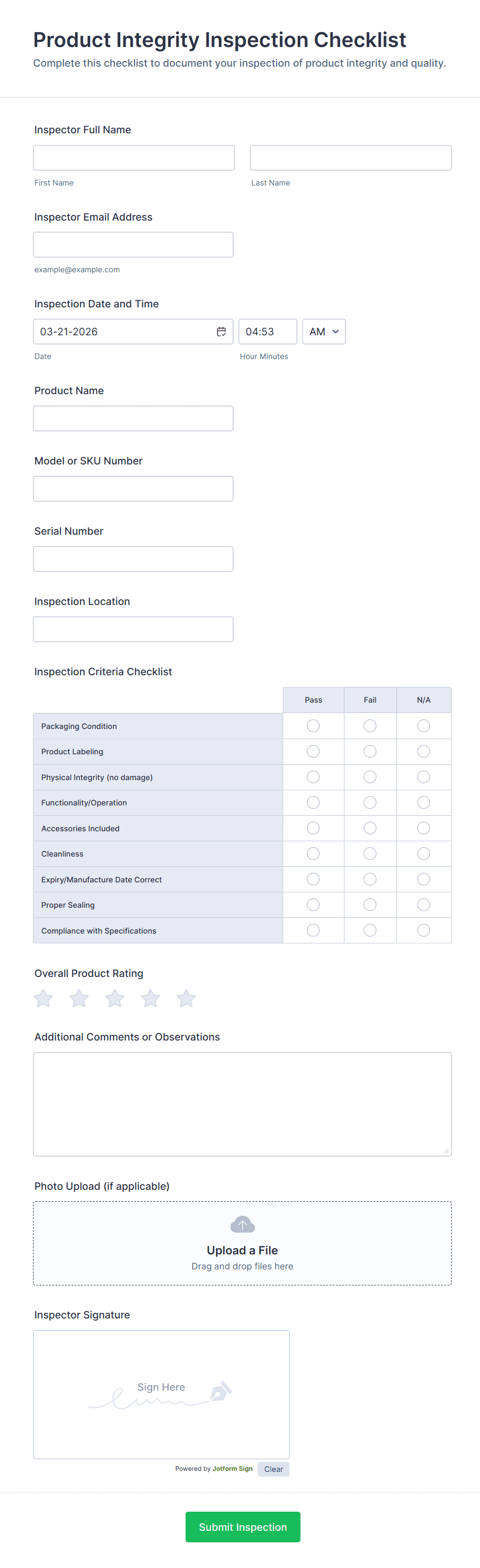 Yes, modern inspection forms—especially digital ones—can include file upload fields for photos and signature fields for verification and accountability.