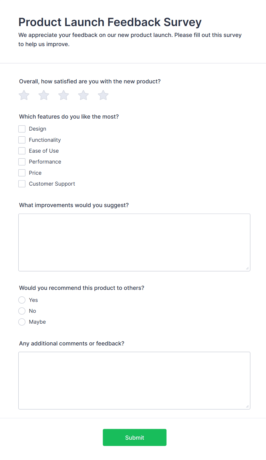 Product Survey Templates are pre-designed forms specifically created to help businesses, product managers, marketers, and researchers gather valuable feedback about products from customers, users, or stakeholders. These templates are used to assess customer satisfaction, collect suggestions for improvement, evaluate product features, and understand user experiences. Product survey forms can be utilized at various stages of a product’s lifecycle — from initial concept testing and beta launches to post-purchase feedback and ongoing product improvement. Common use cases include new product feedback, feature prioritization, usability testing, and post-launch satisfaction surveys.