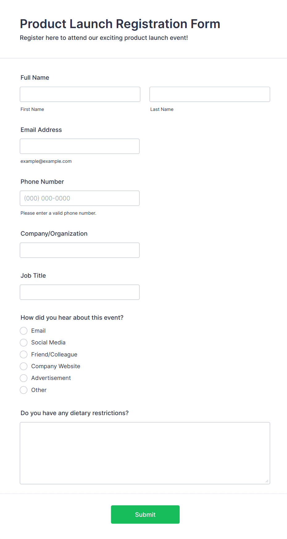 • Content and fields vary based on event type: For example, a conference form may include session selection and company details, while a wedding RSVP form might ask for meal preferences and plus-one information.