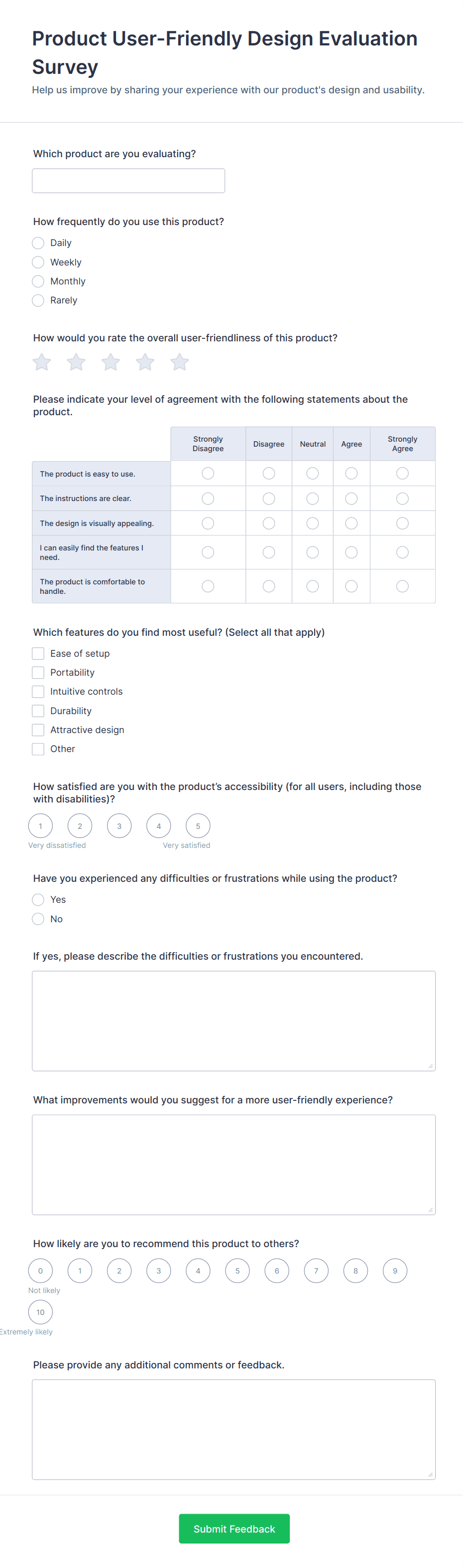- Multiple choice and rating scales for satisfaction or feature evaluation.