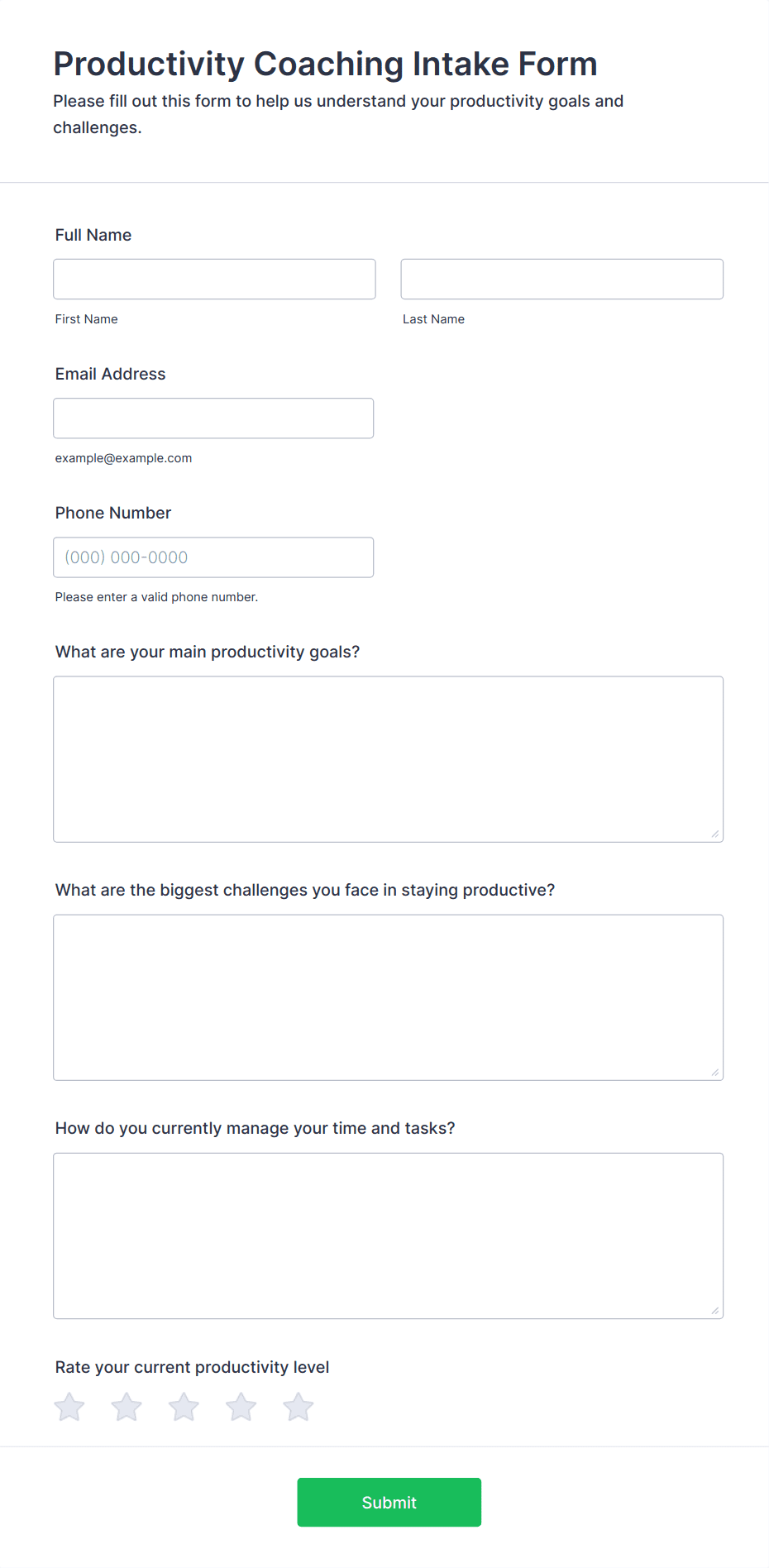 • Intake forms: Include background questions, coaching goals, and consent fields.