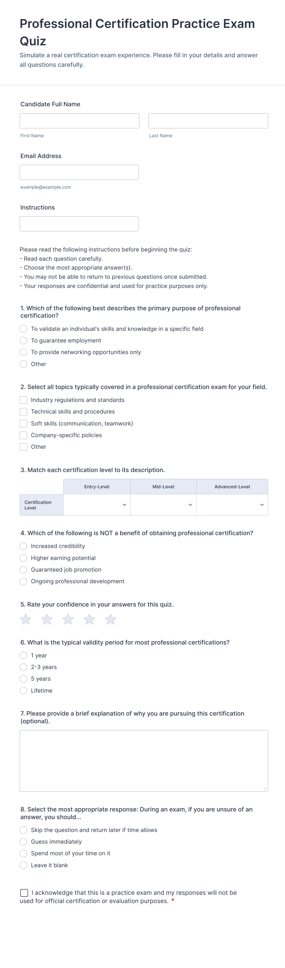 Quiz Templates are pre-designed forms specifically created to facilitate the process of building quizzes for a variety of purposes, such as education, employee training, lead generation, event engagement, and more. These templates provide a structured way to present questions, collect answers, and automatically score or evaluate responses. Whether you’re a teacher assessing student knowledge, a business running a product knowledge test, or a marketer creating a fun personality quiz, Quiz Templates offer a flexible foundation to suit your needs. They can be used for online exams, trivia games, onboarding assessments, customer feedback quizzes, and interactive learning modules.