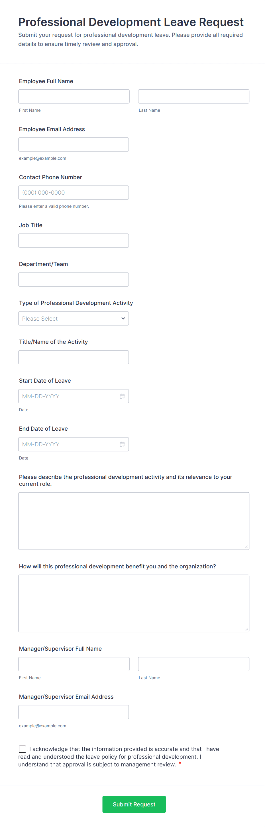 Leave Request Form Templates are digital forms designed to streamline the process of requesting and managing employee absences within organizations. These templates are commonly used by HR departments, team leaders, and managers to collect essential information from employees who need to take time off for reasons such as vacation, sick leave, personal days, parental leave, or other special circumstances. By standardizing the leave request process, these forms help ensure that all necessary details—such as dates, type of leave, reason for absence, and approval status—are captured efficiently and consistently. Use cases range from small businesses tracking vacation days to large enterprises managing complex leave policies across multiple departments.