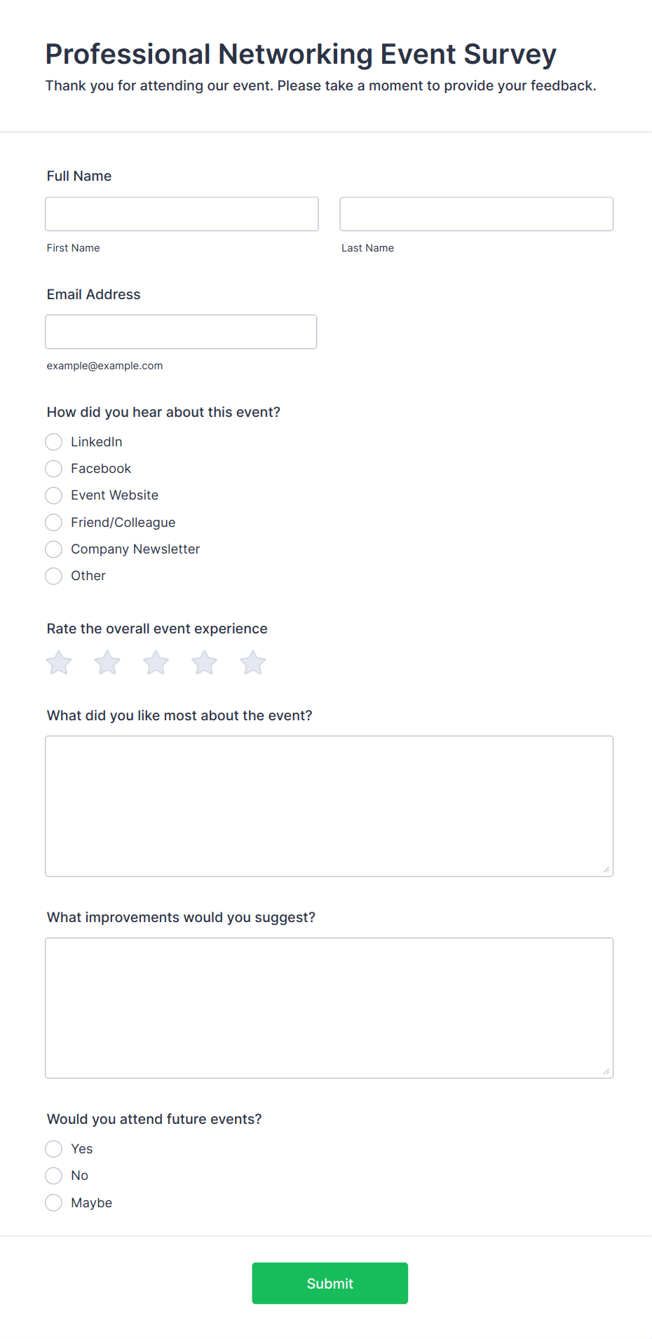 - Event Feedback Surveys: Evaluate attendee satisfaction and gather suggestions for future events.