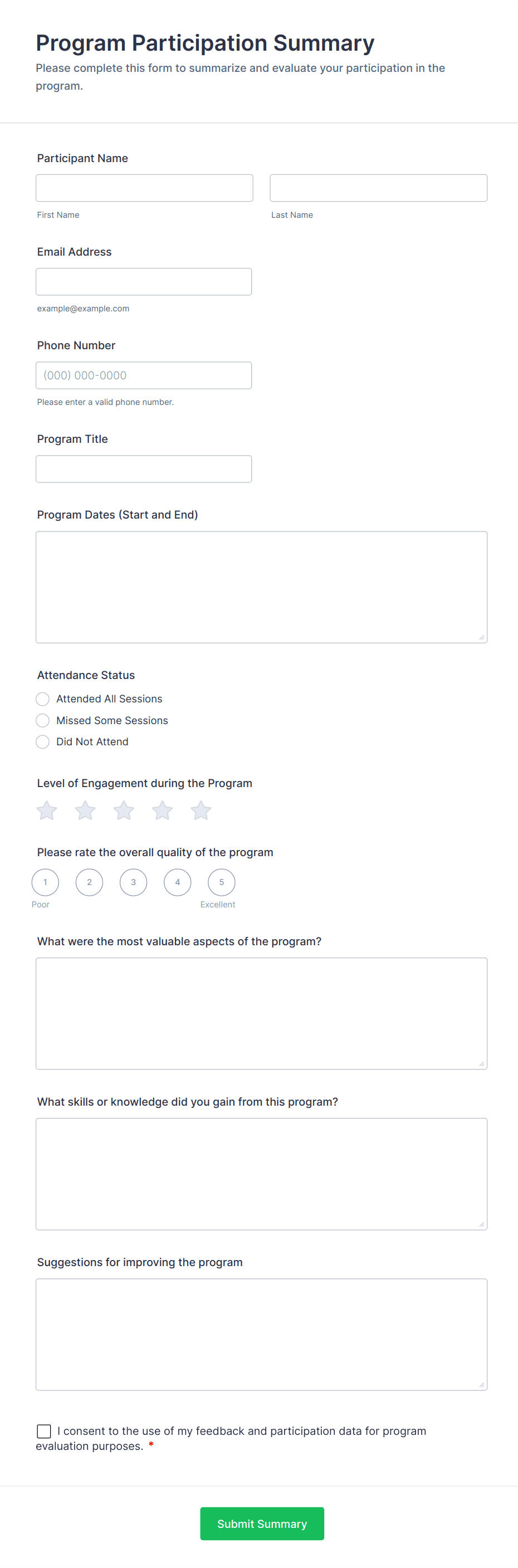Collect participant feedback and program outcomes with the Program Participation Summary Form, ideal for schools, nonprofits, and training teams that need consistent data collection and easy tracking of each form submission in Jotform.