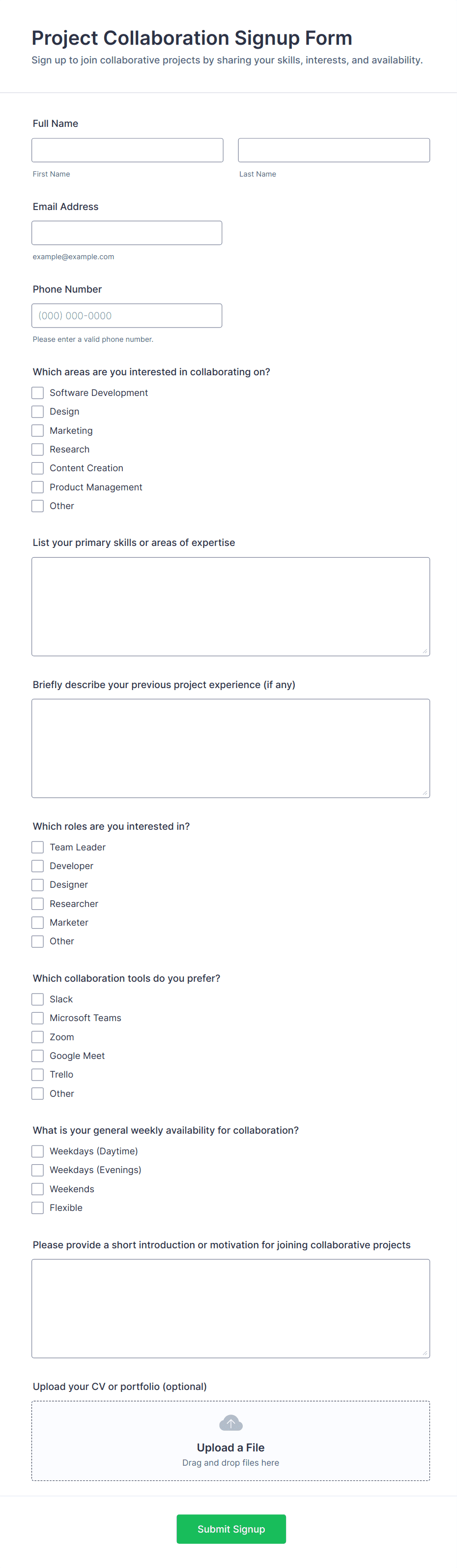 Sign up forms are essential digital tools used to collect information from individuals who wish to join, subscribe, or participate in a service, event, or platform. Whether you’re managing event registrations, building an email subscriber list, onboarding new members, or recruiting volunteers, sign up forms streamline the process of gathering key details such as names, contact information, preferences, and consent. Their versatility makes them invaluable for businesses, educational institutions, nonprofits, clubs, and community organizations looking to efficiently manage participation and engagement.