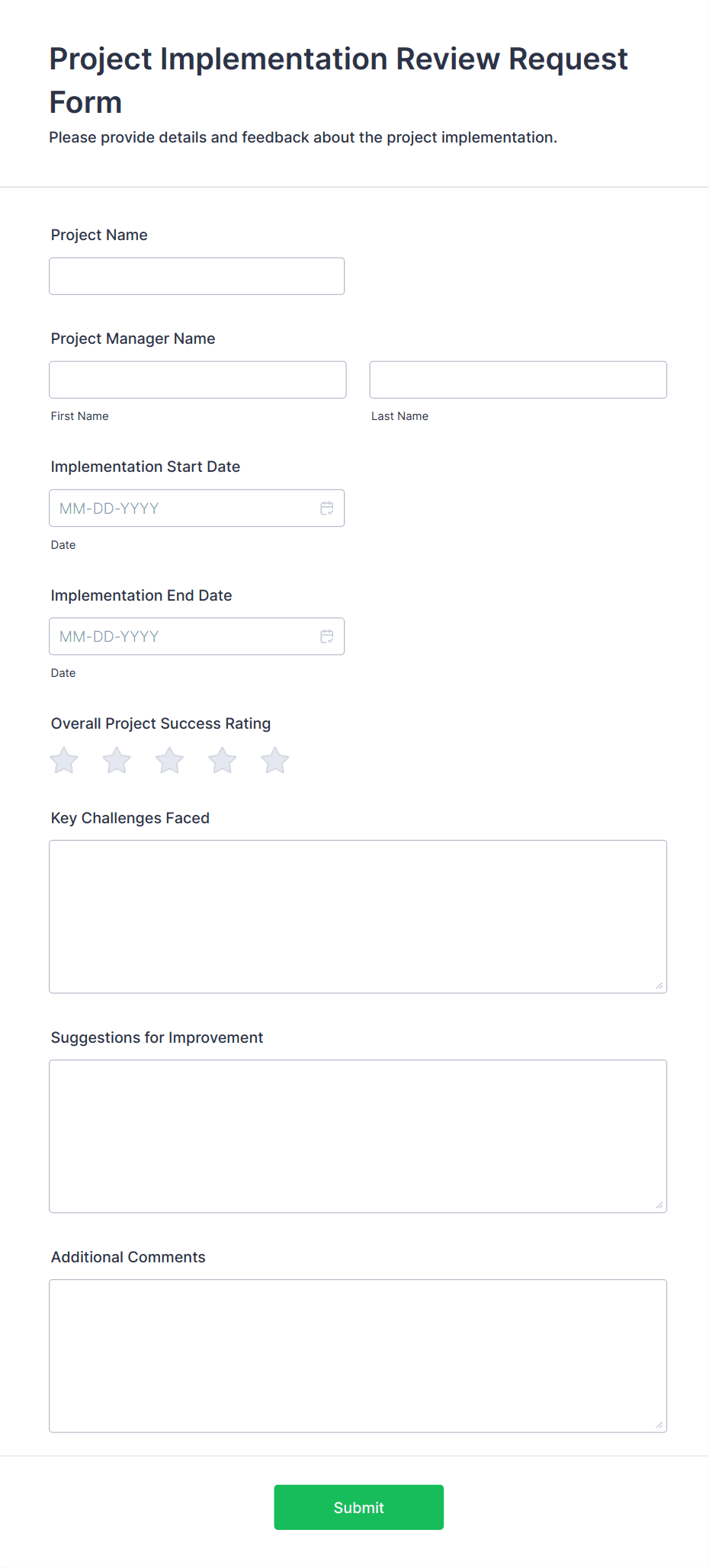 • Employee feedback forms for performance reviews or workplace improvement