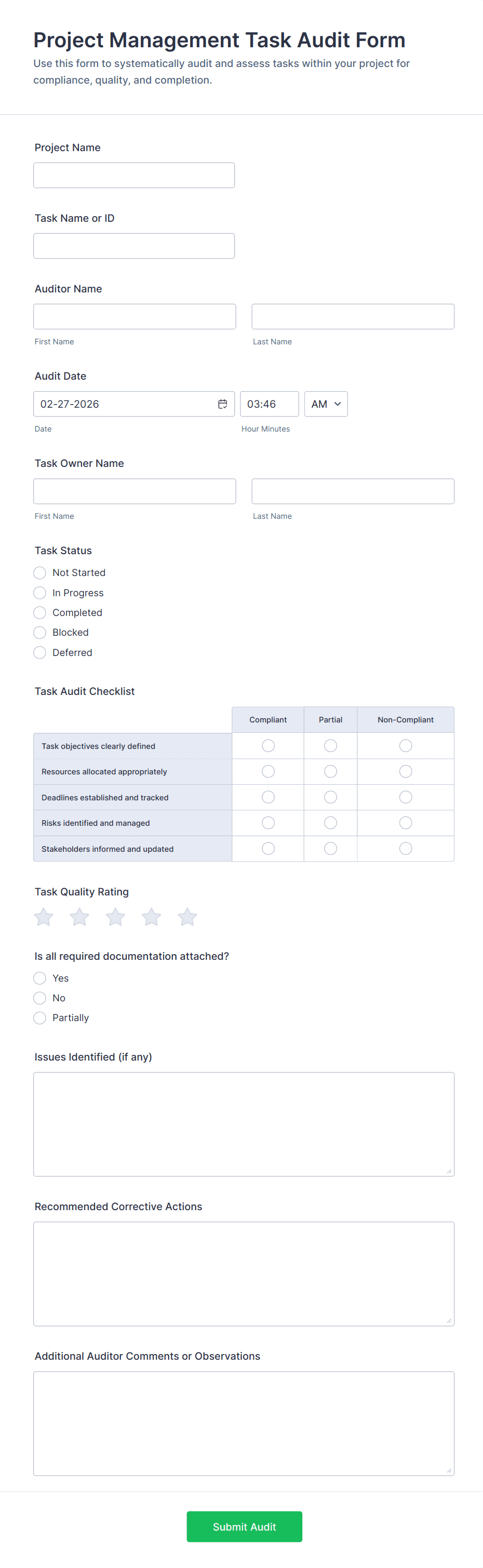 - Customize fields based on your audit type (e.g., safety, quality, compliance).