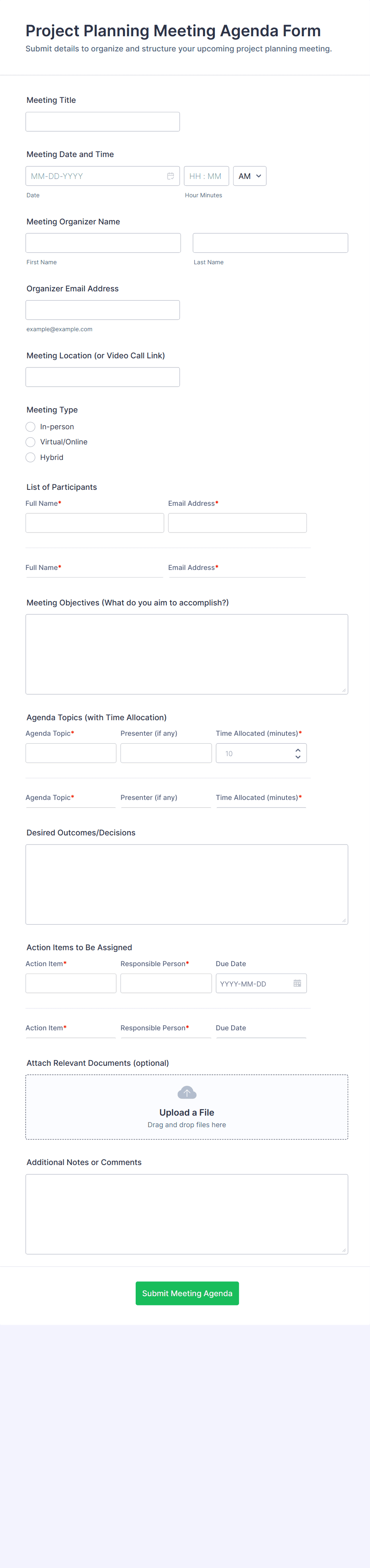 A meeting form is an online tool used to organize, schedule, and manage meetings by collecting essential information such as attendee details, agenda items, and feedback.