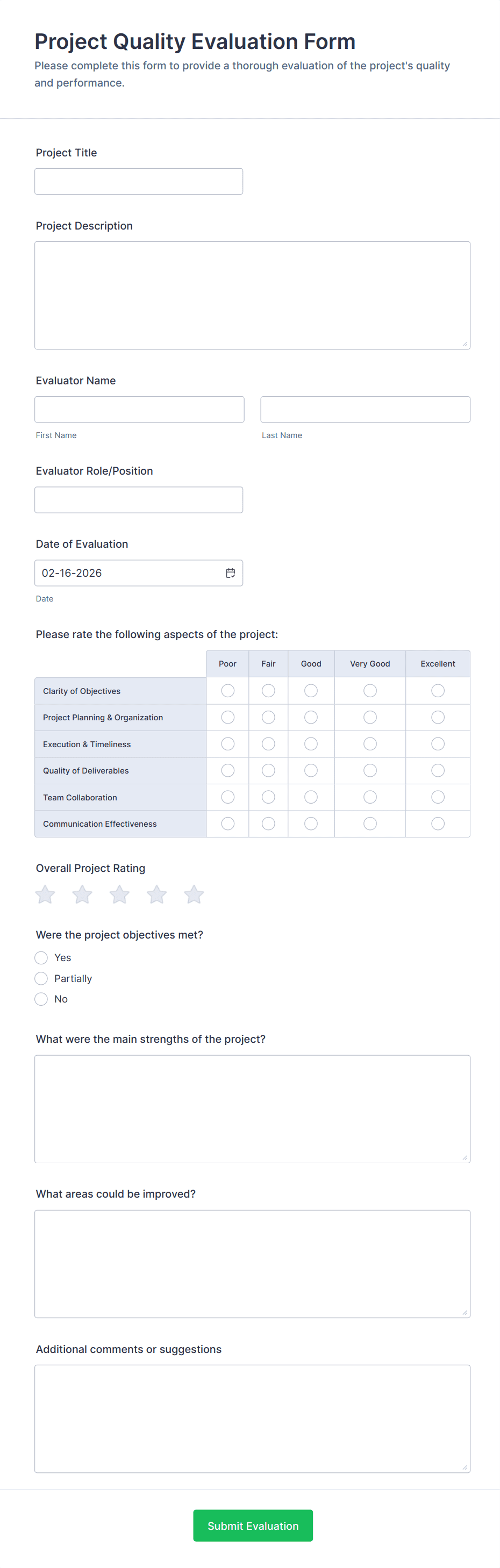 - Short and long text fields for open-ended feedback.