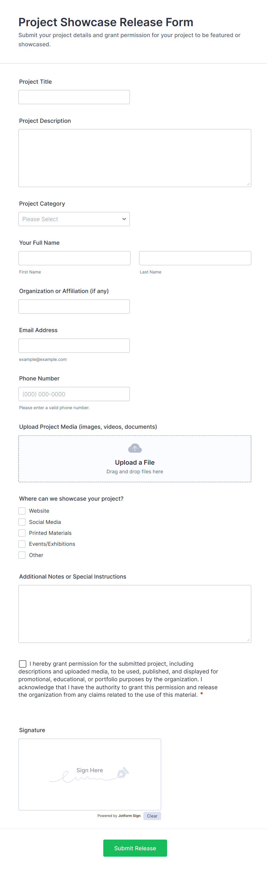 A media release form lets you collect and store information related to press releases and media releases. Focus on your next press release without worrying about losing a single piece of important information with Jotform!