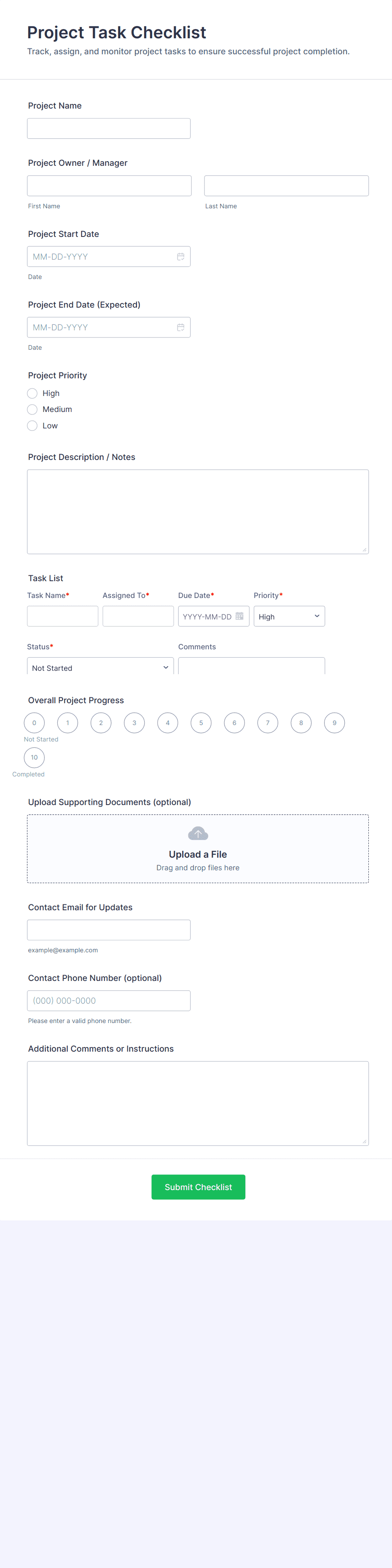 • For more complex checklists, add dropdowns, file upload fields (for attaching evidence or reports), or signature fields (for verification).