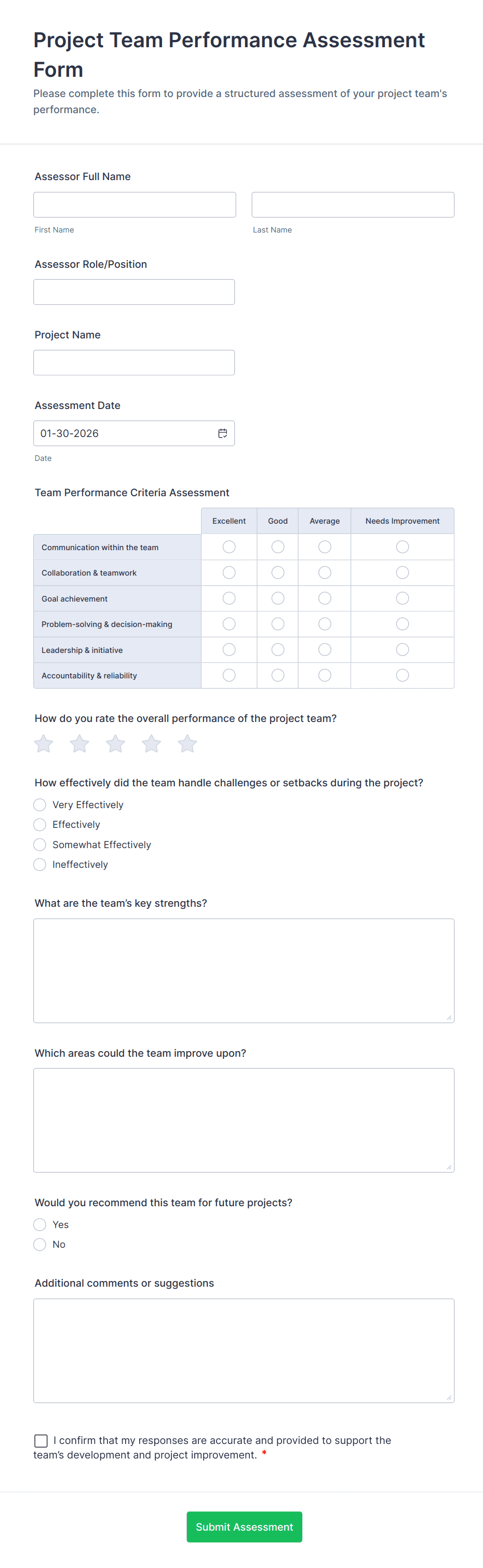 Yes, forms can be tailored for employee reviews, student assessments, project milestones, athletic performance, and more, each with unique fields and evaluation criteria.
