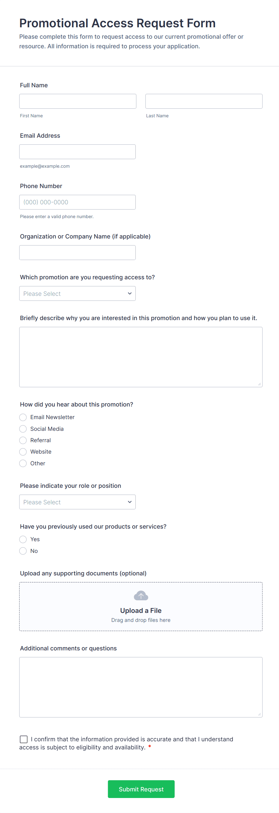 Access control forms are structured documents used to request, approve, and document access to physical locations, systems, or restricted resources. They help organizations manage who can enter certain areas, use specific equipment, or access sensitive digital systems by collecting consistent details such as requester identity, access level, justification, and approval records. Access control forms are commonly used in offices, campuses, data centers, hospitals, warehouses, and IT environments for badge requests, visitor access, temporary passes, role-based system access, and permission changes. By standardizing access requests, these forms reduce security risks, improve accountability, and create clear audit trails.