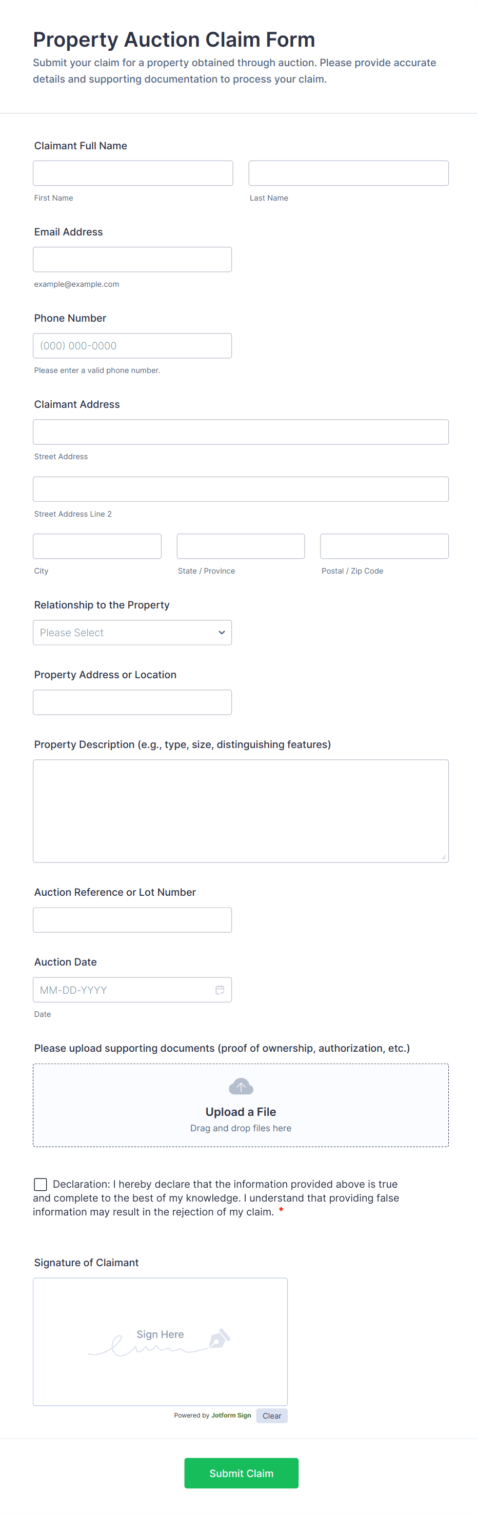 - Use Jotform’s conditional logic to show or hide fields based on user responses (e.g., only display additional fields if a certain claim type is selected).