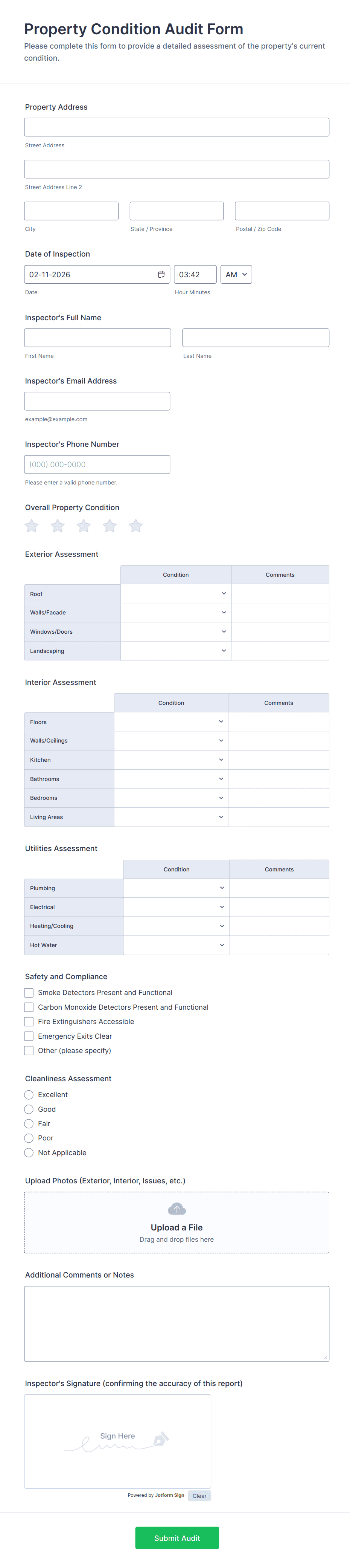 The Rental Property Inspection Form helps property managers and landlords assess rental units' conditions, ensuring accurate documentation and streamlined inspections.