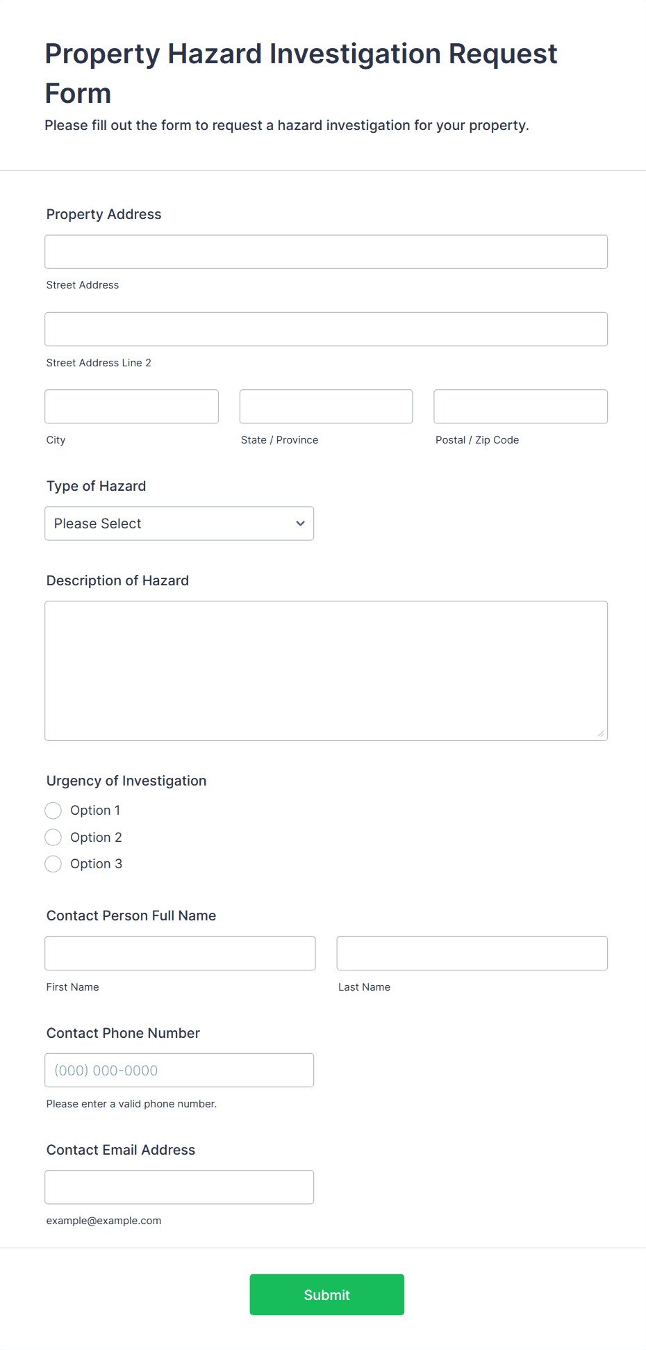 • Maintenance Requests: Tenant name, unit number, issue description, urgency level, file upload for photos.