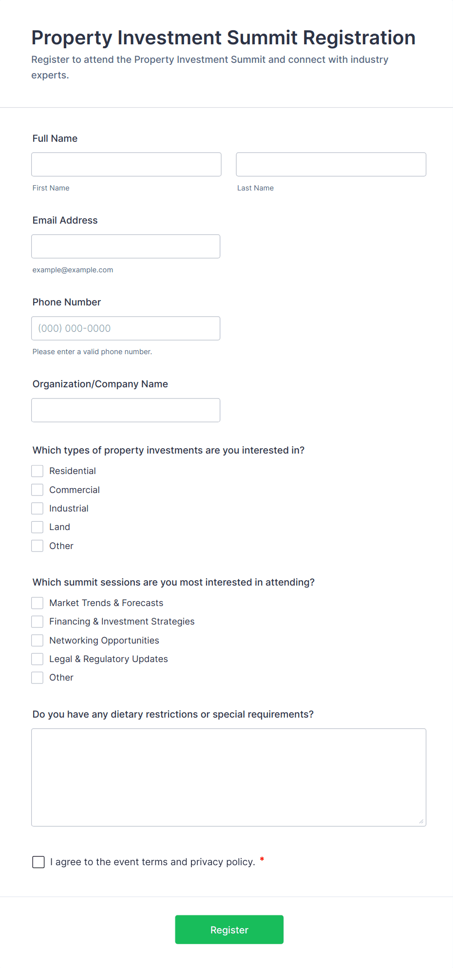 • For speaker or exhibitor forms, add fields for presentation topics, company details, or booth preferences.