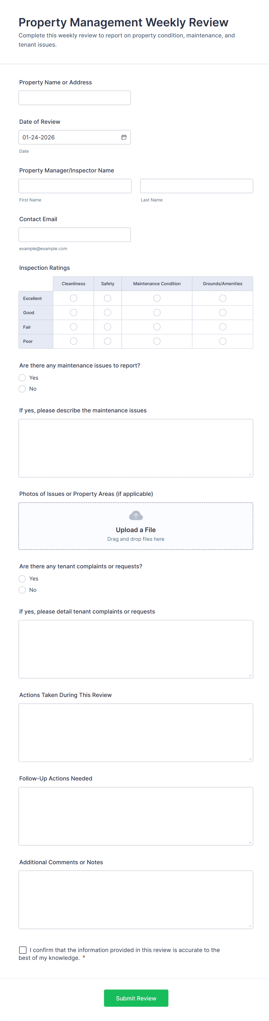 • Maintenance Requests: Tenant name, unit number, issue description, urgency level, file upload for photos.