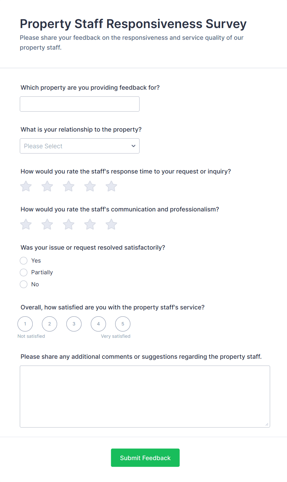 A property management survey is a customer feedback survey that allows residents to rate any apartment complex they live in.