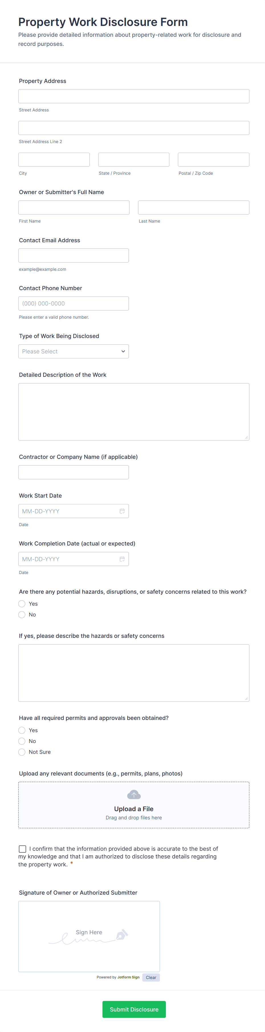 The form templates here are for informational purposes only. Jotform is not providing legal, financial, or other advice, or implying that the forms are legally valid in all or any jurisdictions. Before using any such form, consult an attorney and/or other applicable professionals to make sure that the form meets your needs, legally and otherwise.