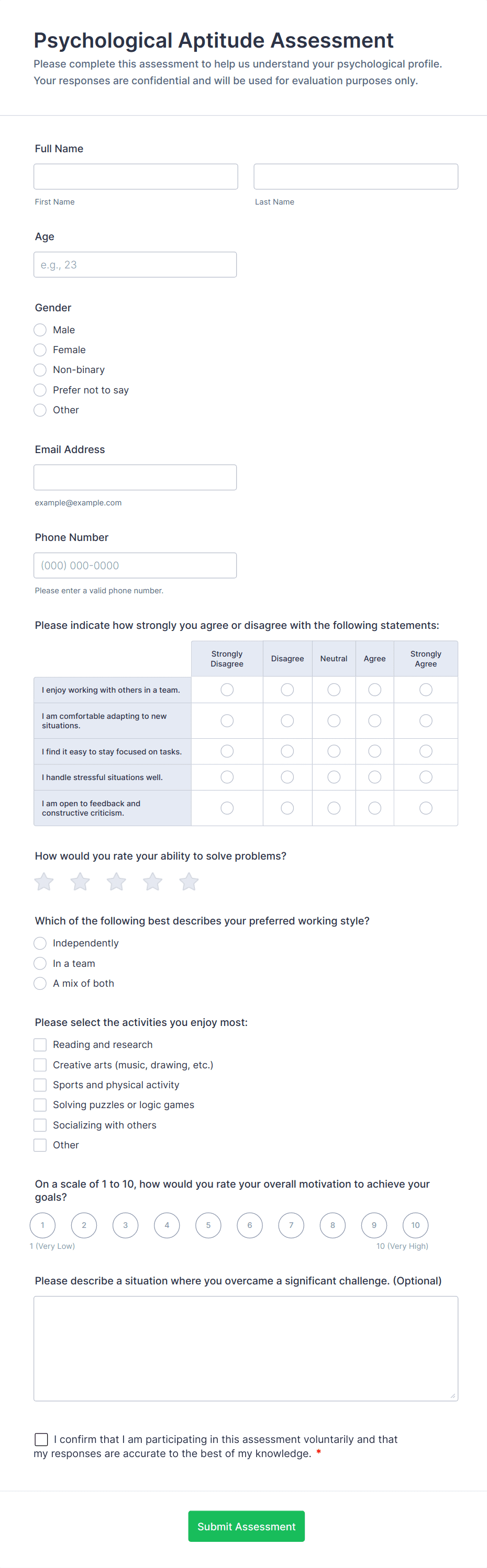 Assessment forms may include personal details, multiple-choice or open-ended questions, rating scales, comment sections, and sometimes automated scoring or feedback fields, depending on the purpose.