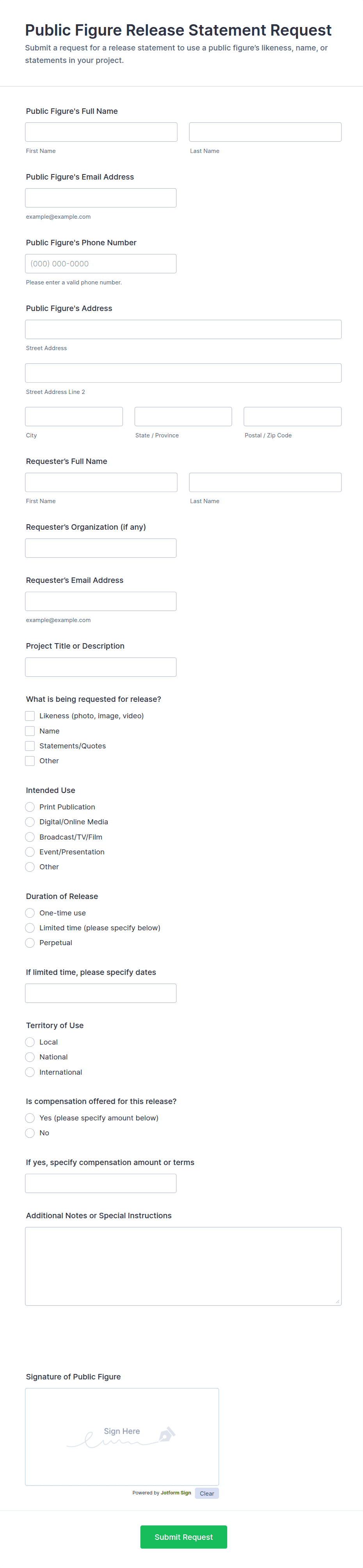A media release form lets you collect and store information related to press releases and media releases. Focus on your next press release without worrying about losing a single piece of important information with Jotform!