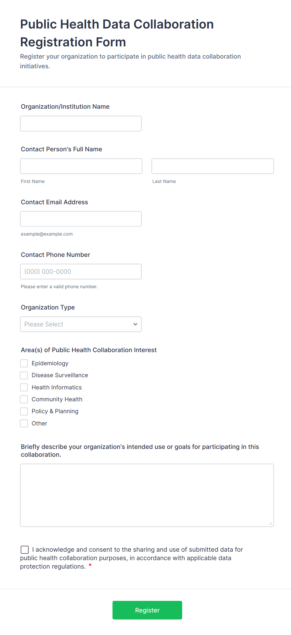 Collect COVID-19 vaccine registrations online. Fill out on any device. Easy to customize, share, and embed. Convert submissions to PDFs instantly. HIPAA friendly features option.