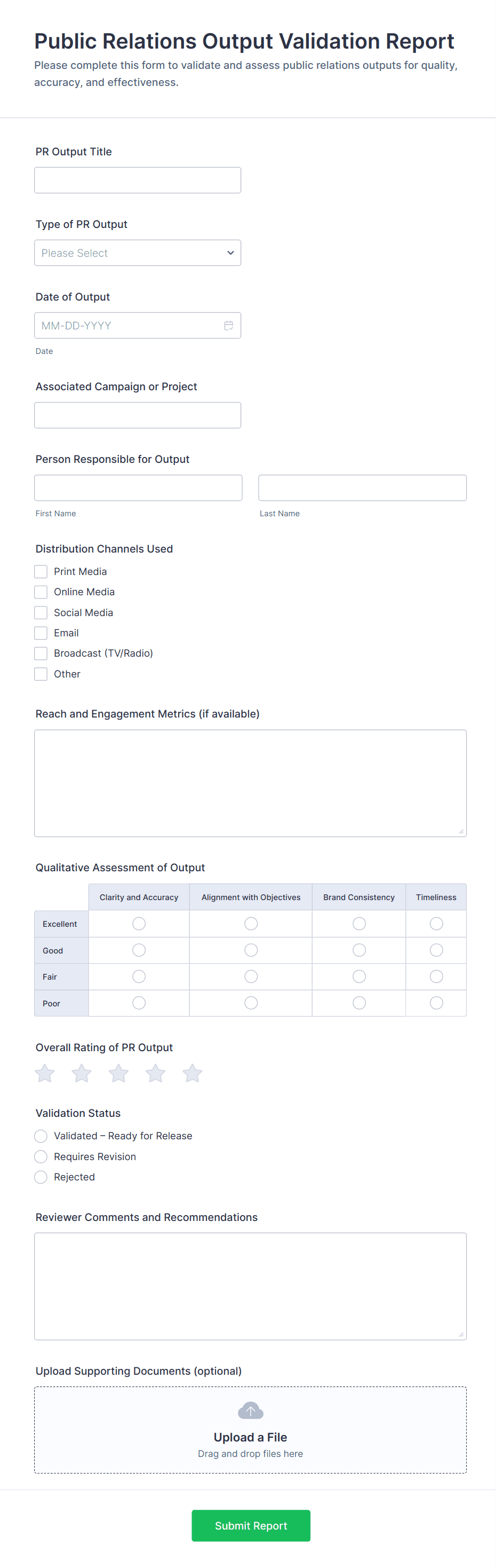 • For business reports: Include fields for dates, metrics, comments, and file uploads.
