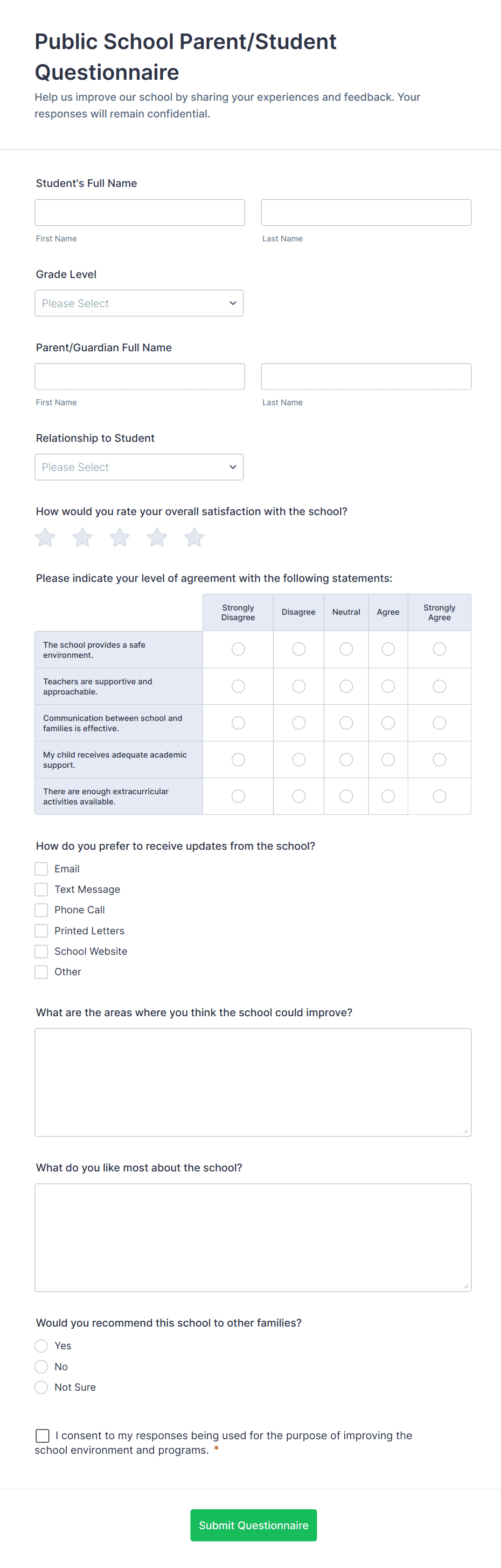 Questionnaire templates are pre-designed forms used to collect structured information from respondents for a variety of purposes, such as research, feedback, assessments, and evaluations. These templates can be tailored to suit different industries and objectives, including customer satisfaction surveys, employee engagement assessments, academic research, health screenings, and market research studies. By providing a consistent framework for gathering data, questionnaire templates help organizations and individuals streamline the process of collecting, analyzing, and acting on valuable insights.