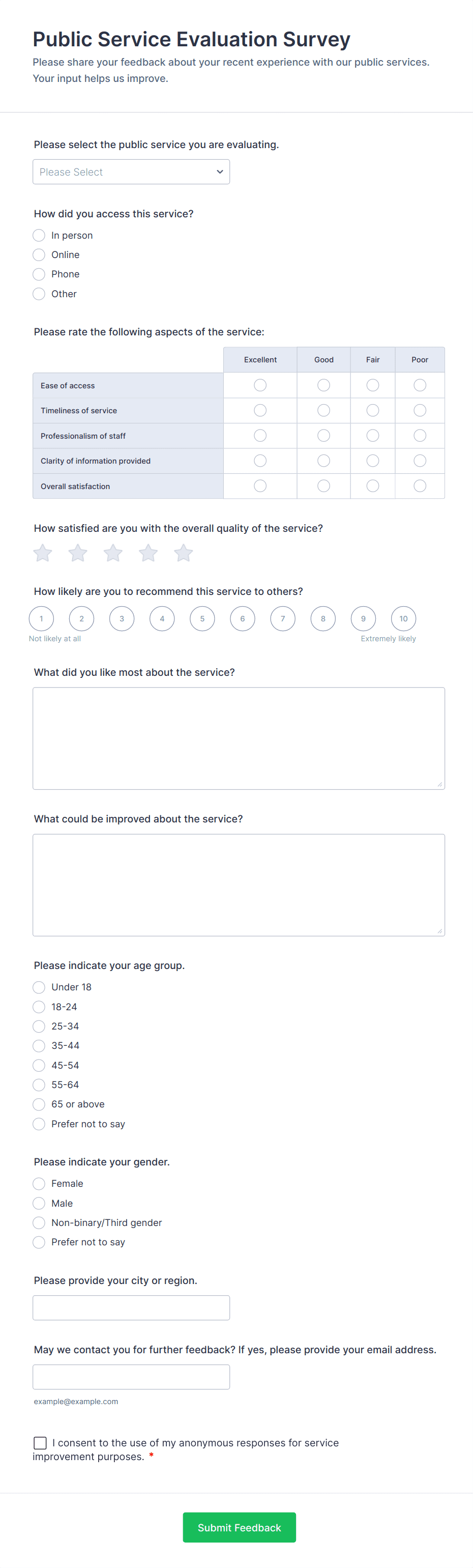 Collect community feedback with the Public Services Awareness Survey in Jotform to measure awareness, usage, satisfaction, and access challenges across regions and demographics for better public service planning.
