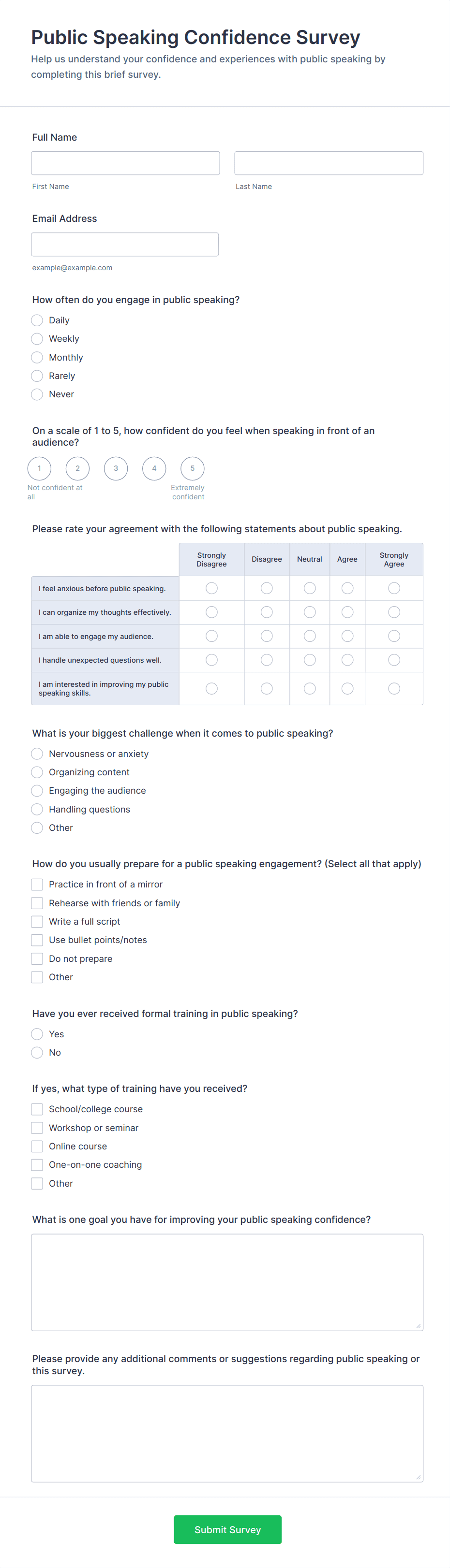 Training Survey Templates are specialized survey forms designed to gather feedback, measure learning outcomes, and assess the effectiveness of training programs. These templates are commonly used by HR departments, corporate trainers, educational institutions, and professional development organizations to evaluate participant satisfaction, knowledge retention, and areas for improvement. Use cases range from post-training feedback surveys and pre-training needs assessments to skills gap analyses and trainer evaluations. By collecting structured feedback, organizations can refine their training content, delivery methods, and overall learning strategies to better meet the needs of their audience.