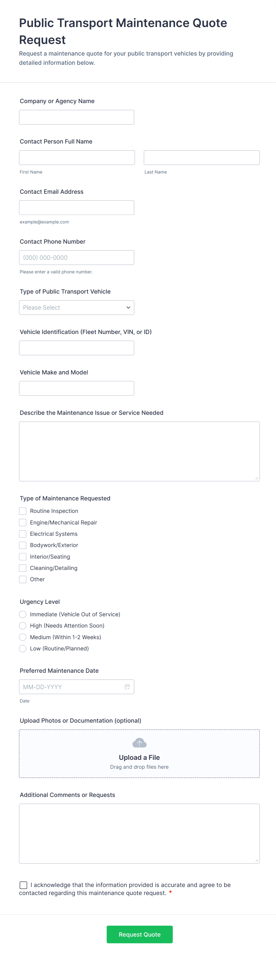 Quote forms are specialized online forms designed to collect information from customers or clients seeking a price estimate for products or services. These forms are commonly used by businesses in industries such as insurance, construction, event planning, logistics, and professional services, where pricing can vary based on specific requirements. By gathering essential details—such as project scope, service preferences, quantities, and contact information—quote forms enable businesses to provide accurate, tailored quotes efficiently. They streamline the initial inquiry process, reduce back-and-forth communication, and help both parties set clear expectations from the outset.