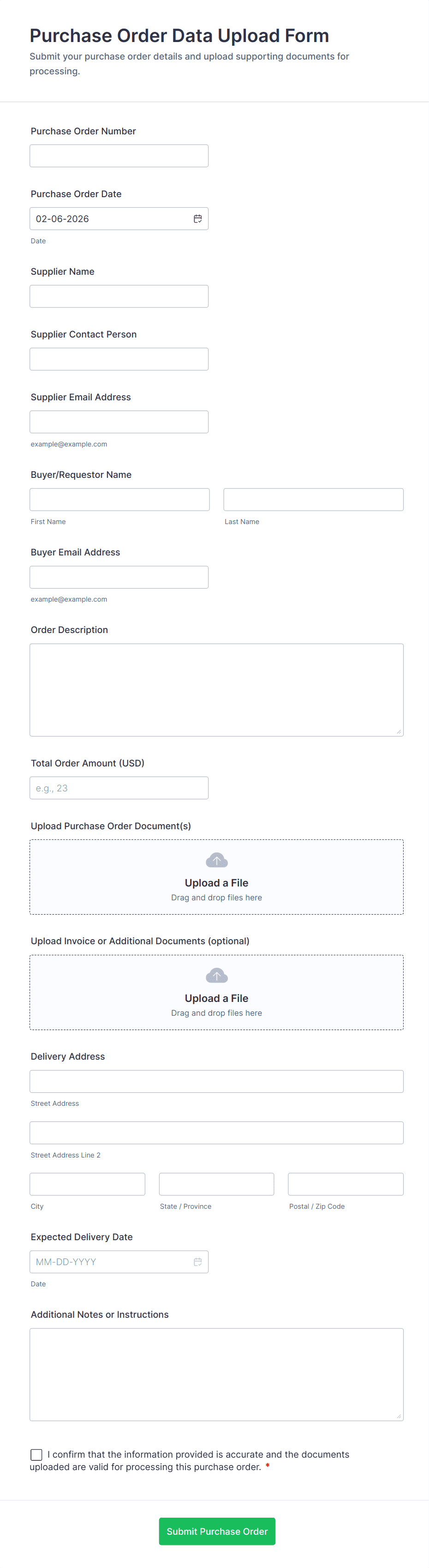 • For vendor orders, include supplier contact fields and shipping instructions.
