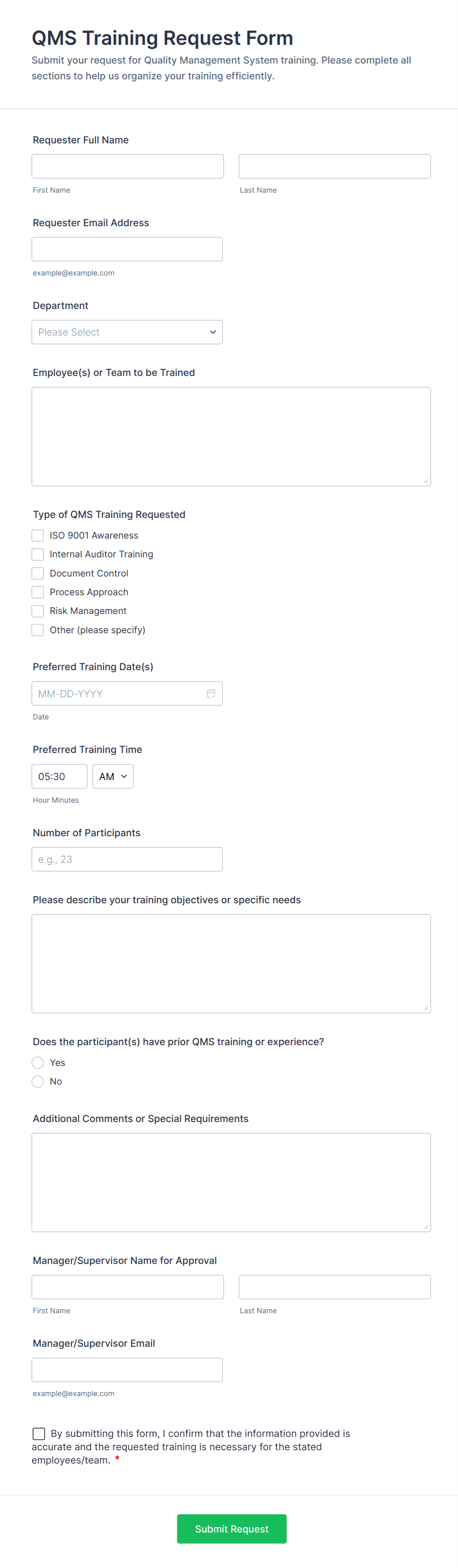 Training forms are specialized digital documents designed to streamline the process of organizing, managing, and evaluating training programs. These forms can be used for a variety of purposes, such as employee onboarding, skills assessments, training feedback, course registrations, pre-training surveys, and post-training evaluations. Organizations of all sizes — from corporate HR departments to educational institutions and training consultants — rely on training forms to collect essential information, track participant progress, and ensure that learning objectives are met efficiently.