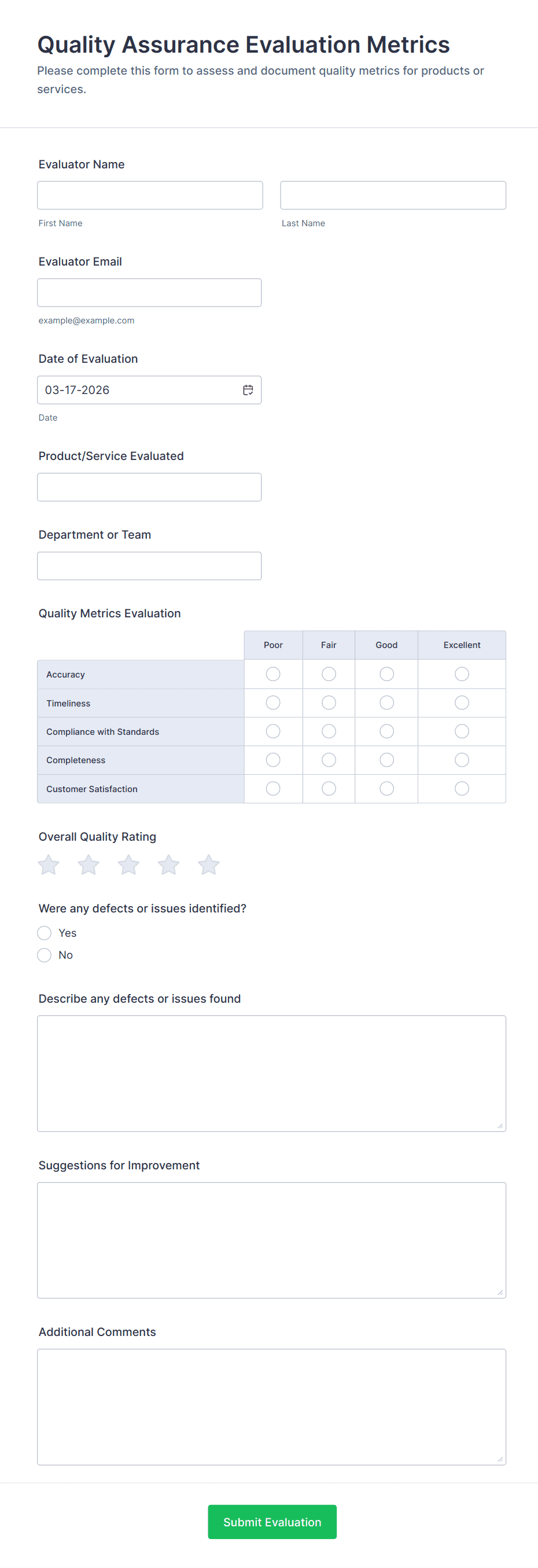 A Quality Assurance Evaluation Form is a questionnaire used by businesses to evaluate the quality of their products or services.