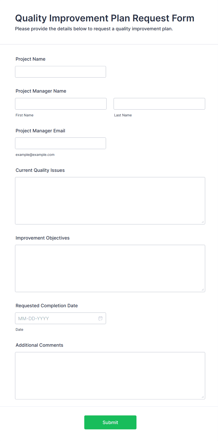 Request forms are essential tools for gathering and organizing information when someone needs to ask for something — whether it’s a service, resource, approval, or support. These forms streamline the process of submitting and managing requests in a wide range of scenarios, such as equipment requests, maintenance requests, time-off requests, IT support, purchase orders, facility bookings, and more. By providing a standardized way to collect all necessary details, request forms help organizations ensure that every request is clear, trackable, and actionable, reducing miscommunication and delays.