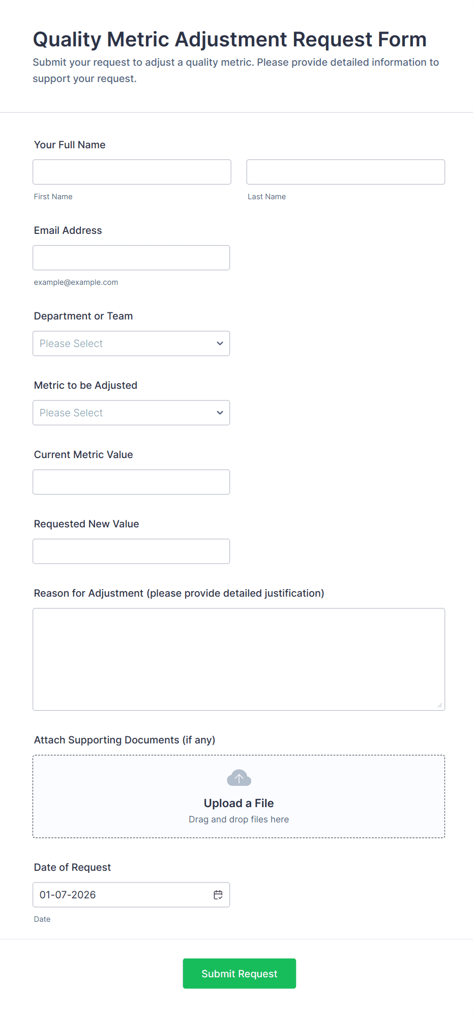 Common fields include requester details, type of adjustment, reason for the request, relevant dates, and supporting documentation.