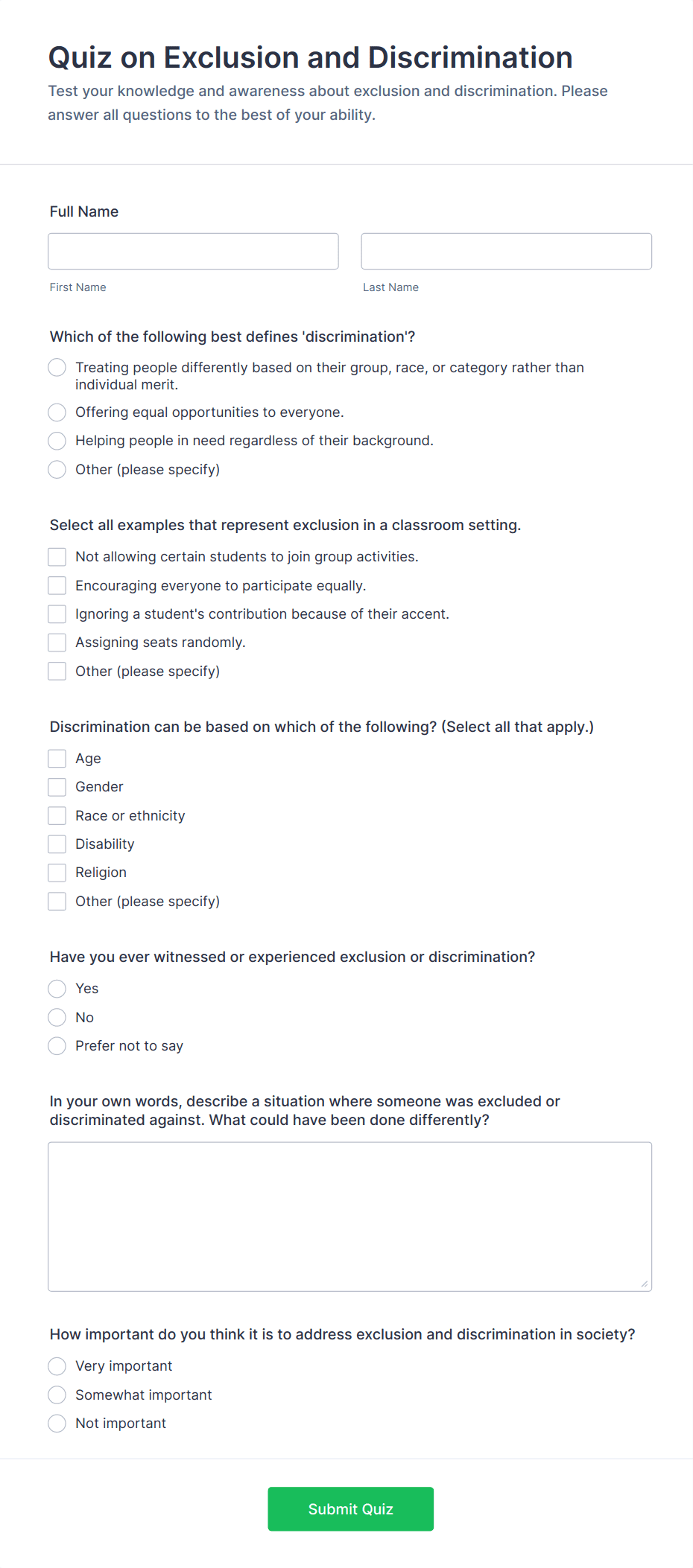 Simple Quiz Template is a form solution for educators and trainers. It streamlines the quiz creation process, allowing customizable questions and automatic grading. Enhance learning experiences effortlessly.